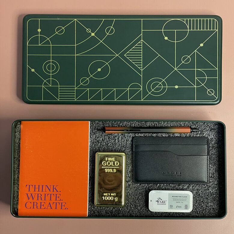 A premium executive gift hamper thoughtfully curated for ambitious professionals, this collection combines a Fragnote pen, gold bar paperweight, vibrant A6 diary, Derby cardholder, and solid cologne. Each item is carefully selected to blend functionality, style, and prestige, making it an ideal choice for corporate gifting, employee recognition, and professional milestones.