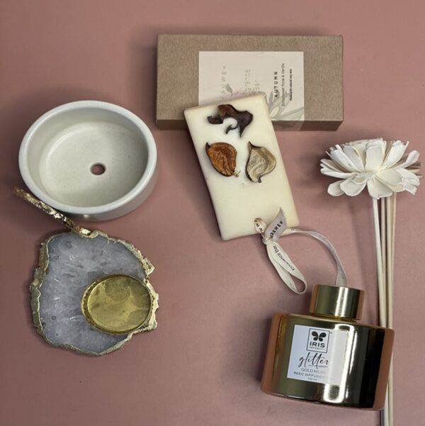 Elevate your gifting experience with a luxury gift hamper that blends elegance, fragrance, and timeless charm. Thoughtfully curated for those who appreciate refined details, this exquisite hamper features stunning agate décor that adds a natural yet sophisticated accent to any space. Paired with a rich gold musk reed diffuser, it fills the room with a warm, captivating aroma that lingers beautifully, creating an inviting atmosphere from the very first moment.