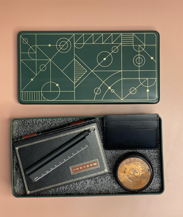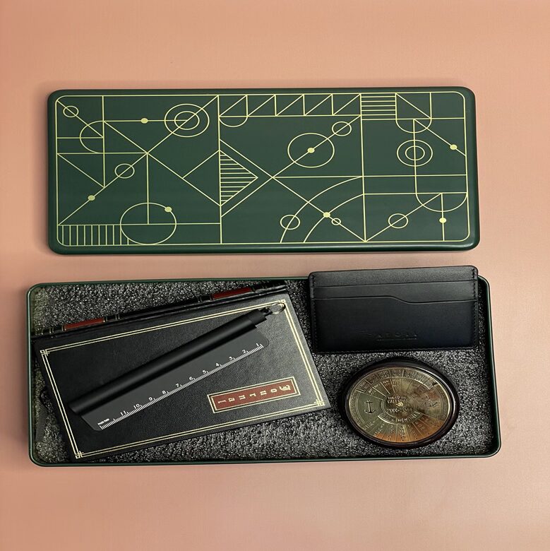 At the heart of the collection is a gold-edged diary, crafted to capture ideas, plans, and reflections with timeless elegance, making every note a sophisticated experience. Paired with a sleek black Metric pen, every signature, memo, or brainstorming session becomes an expression of style and precision. Adding a touch of inspiration and adventure, the compass symbolizes direction, focus, and purposeful ambition, while the Derby cardholder combines sleek design with practicality, keeping essential cards organized in true executive fashion.