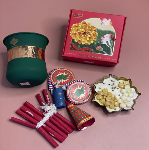 Celebrate Diwali with a premium gift hamper that beautifully blends tradition, elegance, and conscious living. Thoughtfully curated for those who value meaningful gestures, this exquisite collection features fragrant rose dhoop cones that fill the air with a soothing, uplifting aroma—setting the perfect festive mood. Paired with a decorative diya, it symbolizes light, positivity, and new beginnings, bringing warmth and radiance to every celebration.