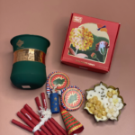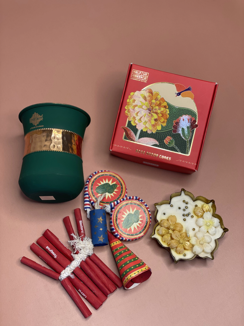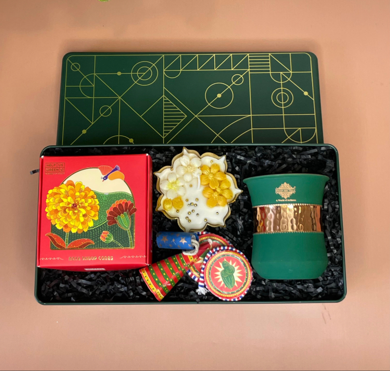 Adding a mindful twist to tradition, the hamper includes innovative plantable crackers—an eco-conscious way to celebrate while giving back to nature. Completing the ensemble is a classic copper glass, known for its timeless appeal and cultural significance, adding a touch of heritage-inspired luxury to the gift.