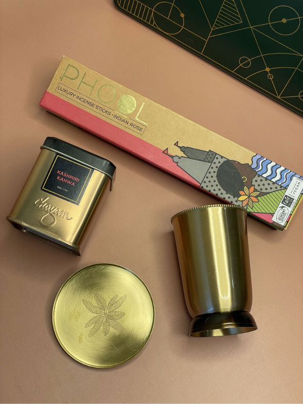 Enhancing the sensory journey are fragrant incense sticks that gently perfume the space, creating an atmosphere of serenity and festive charm. Handcrafted coasters add an artisanal touch to every gathering, blending beauty with functionality, while classic metal drinkware brings timeless sophistication to the table. Each element is chosen to reflect heritage, craftsmanship, and elevated taste.