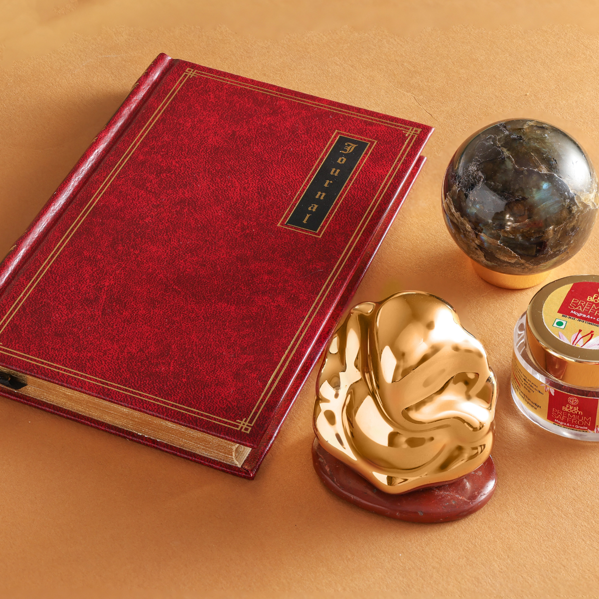 The Prosperity Manifestor is a premium luxury gift hamper designed to inspire abundance, intention, and success. This exclusive collection features a beautifully crafted Ganesha with natural gemstone, symbolizing wisdom and new beginnings, paired with a striking Labradorite paperweight known for its captivating sheen and empowering energy. The hamper also includes the elegant Matrikas Antique Journal—perfect for mindful reflections and goal setting—along with pure Kesar that adds a touch of richness and tradition.