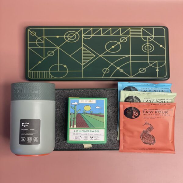 Complementing it is a pack of Blue Tokai coffee, delivering a rich, aromatic experience that energizes the mind while providing a moment of indulgent pause. To complete this wellness journey, the hamper includes Phool essential oil, known for its soothing and calming properties, bringing a touch of serenity and mindfulness to everyday moments. Together, these elements create a harmonious blend of relaxation, refreshment, and refinement.