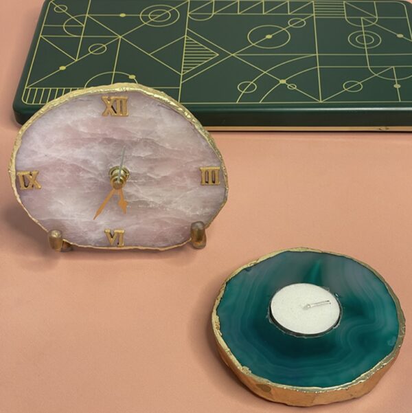 The agate candle holder casts a warm, ambient glow, elevating any space with understated refinement. Complementing it, the rose quartz desk clock adds a soft, polished accent to workspaces or living areas, offering both functionality and a touch of serene charm. Together, they create a statement of taste, appreciation, and enduring value.