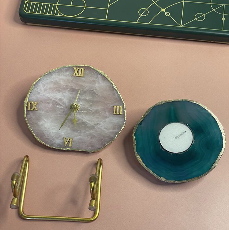 The agate candle holder casts a warm, ambient glow, elevating any space with understated refinement. Complementing it, the rose quartz desk clock adds a soft, polished accent to workspaces or living areas, offering both functionality and a touch of serene charm. Together, they create a statement of taste, appreciation, and enduring value.