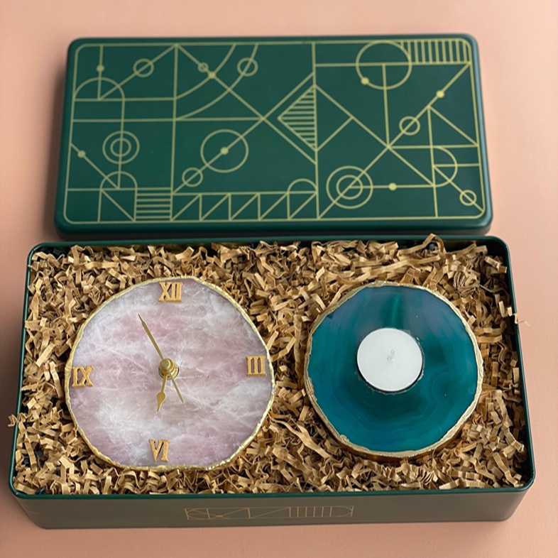 Discover a premium gift hamper designed to impress at first glance and remembered long after it’s opened. This sophisticated ensemble brings together an exquisite agate candle holder—celebrated for its natural patterns and luminous finish—and a graceful rose quartz desk clock that symbolizes harmony and timeless elegance. Each piece is thoughtfully selected to blend beauty with meaning, making the hamper as purposeful as it is luxurious.